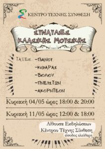 Συναυλίες Κλασικής Μουσικής από τους μαθητές του Κέντρου Τέχνης Σύνθεση. Μαθητές όλων των ηλικιών και επιπέδων παρουσιάζουν τη δουλειά τους σε τέσσερεις συναυλίες με μεγάλη ποικιλία ηχοχρωμάτων.Θα παρουσιαστούν οι τάξεις:Πιάνου: