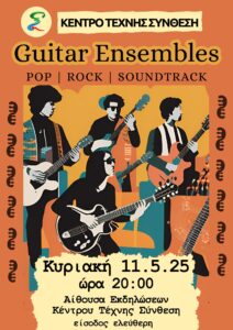 Σύνολα από Κιθάρες, Ηλεκτρικές, Ακουστικές, Κλασικές και Μπάσα παρουσιάζουν ένα ιδιαίτερο πρόγραμμα με Pop, Rock και Soundtrack μουσικές. Μαθητές όλων των επιπέδων των τμημάτων κιθάρας παρουσιάζουν πολύ γνωστές επιτυχίες σε