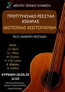 Προπτυχιακό Ρεσιτάλ της Δέσποινας Κωστογλούδη. Ρεσιτάλ Κλασικής Κιθάρας εν όψει των επερχόμενων Πτυχιακών Εξετάσεων της Δέσποινας Κωστογλούδη. Θα ακουστούν έργα των: J. S. Bach, S. L. Weiss, M. Giuliani, H.