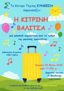 Η Κίτρινη Βαλίτσα μας ταξιδεύει σε προορισμούς μαγικούς! Με την μουσική συνταξιδιώτη θα περάσουμε από μέρη εξωτικά και μακρινά. Θα συναντήσουμε απρόσμενους φίλους και θα τραγουδήσουμε και θα χορέψουμε μαζί